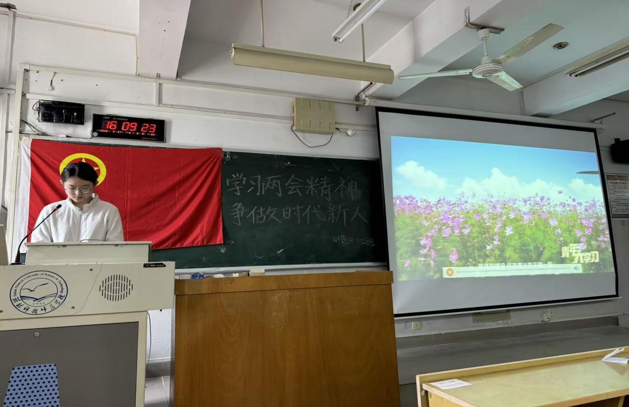团支书闫若琪从两会的基本概念、召开流程,梳理了政府工作报告中的核心内容,与同学们一起重点学习了“支持青年创新创业”“深化财税体制改革”“推动高质量发展”等与青年成长、专业学习紧密相关的热点议题,让同学们感受到两会不仅是国家治理的重要平台,更与每一位青年的职业规划、专业发展息息相关。