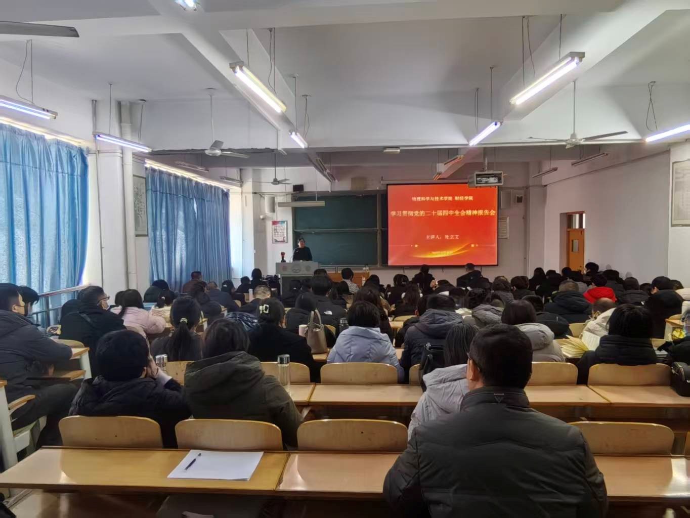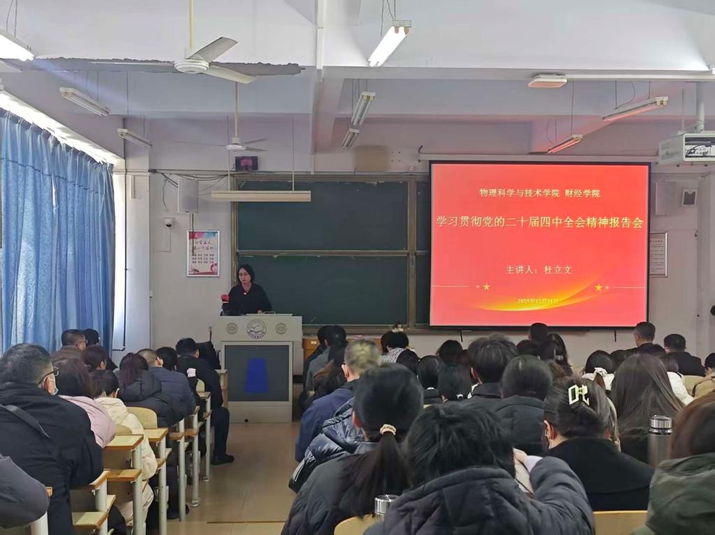 12月11日,物理科学与技术学院、财经学院在秦皇岛校区逸夫楼A309教室共同举办了党的二十届四中全会精神宣讲报告会。本次报告会邀请到了学校思想政治理论教育宣讲团成员、马克思主义学院副教授杜立文作宣讲报告。物理学院和财经学院共有120余名师生参加了此次宣讲报告会。