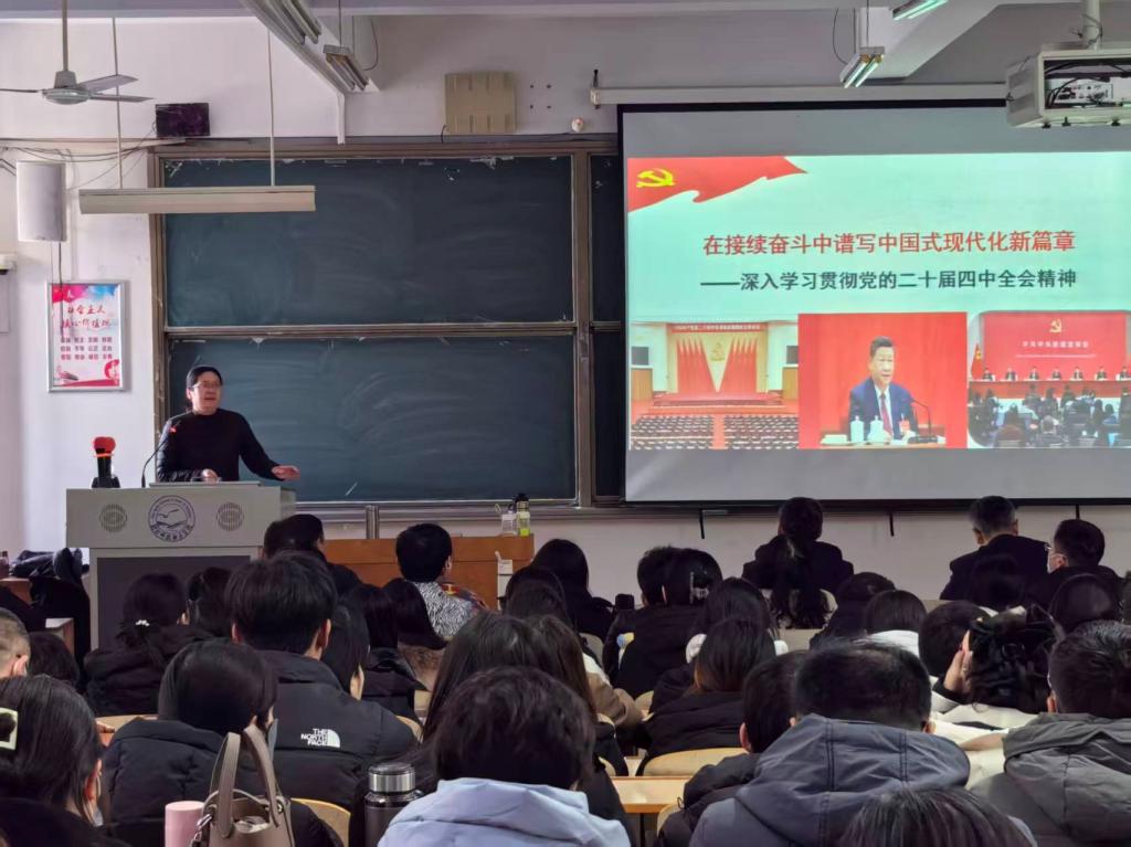 会上,杜立文副教授作了题为《在接续奋斗中谱写中国式现代化新篇章——深入学习贯彻党的二十届四中全会精神》的精彩报告,报告围绕深刻领会党的二十届四中全会的重大意义、鲜明特点、主要内容和践行要求等四个方面重点内容,深入浅出地系统解读了党的二十届四中全会召开的历史背景、“十四五”时期我国发展取得的重大成就和“十五五”时期经济社会发展的指导方针和主要目标。