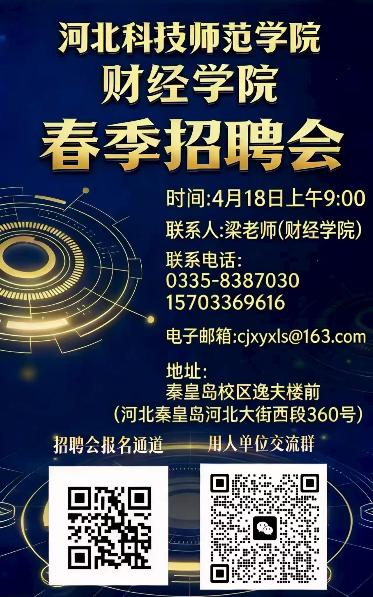 财经学院2026届毕业生春季招聘会于4月18日在河北科技师范学院秦皇岛校区举行,诚邀各单位到我院选聘优秀人才,欢迎各用人单位扫码报名,咨询电话0335-8387030。(编辑:路荞华 审核:于秀敏)