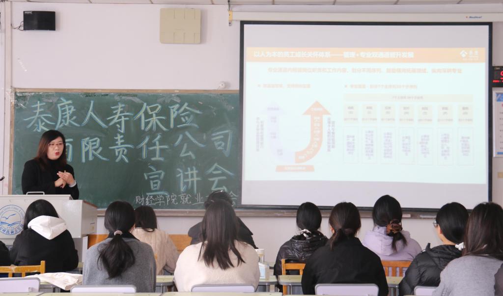 为帮助财经类学子精准对接优质就业资源,明晰大健康产业就业方向,2025年10月21日财经学院特邀泰康保险集团子公司——泰康人寿保险有限责任公司在A509教室举办2026年校园招聘专场宣讲会。本次宣讲会以“长寿时代 共筑未来”为主题,吸引众多学生参与。