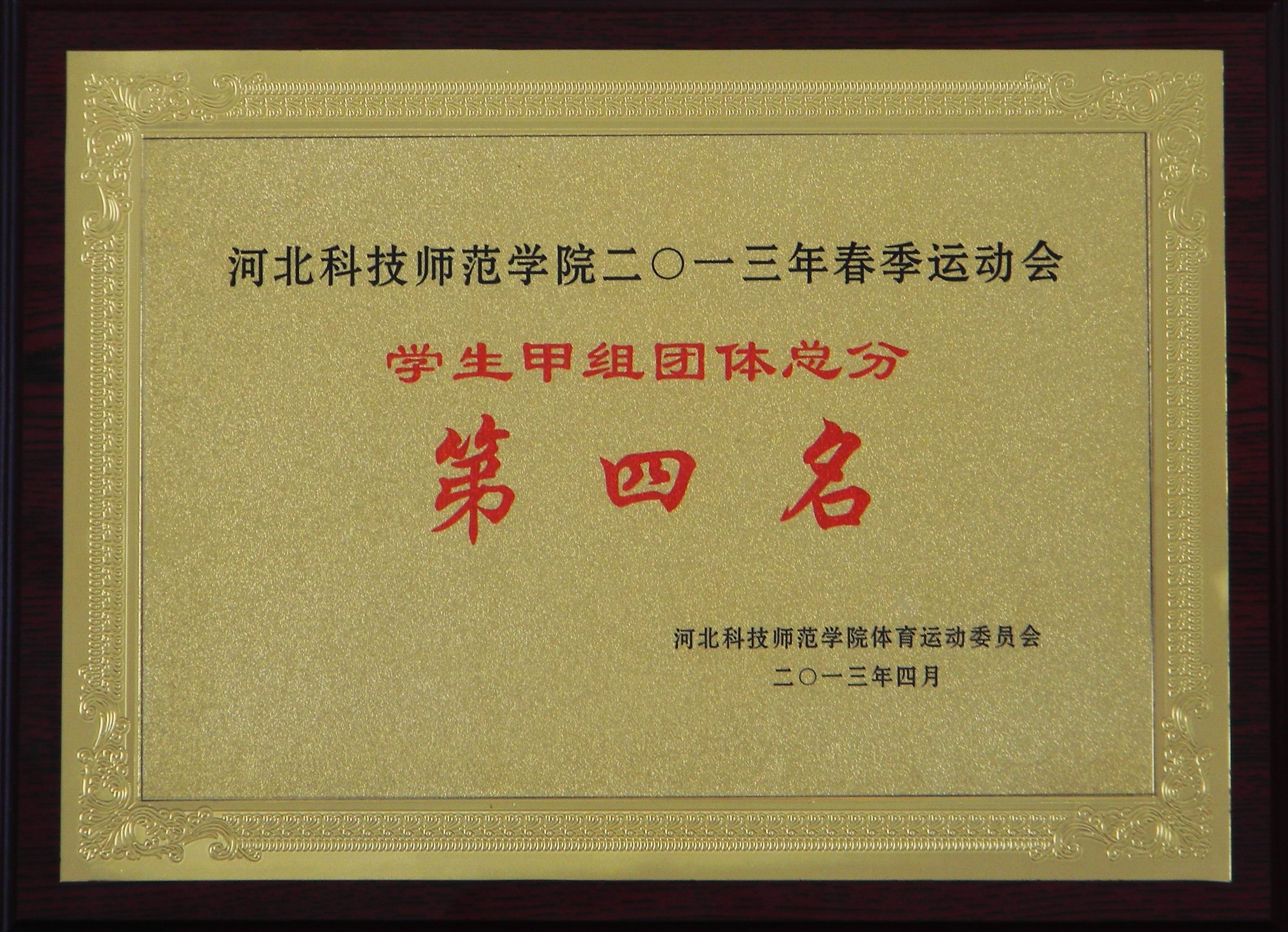 在学生会体育部的认真筹备下,经过学院全体运动员的共同努力,我院荣获2013年春季运动会学生甲组团体总分第四名的好成绩。 图为奖牌[详细]