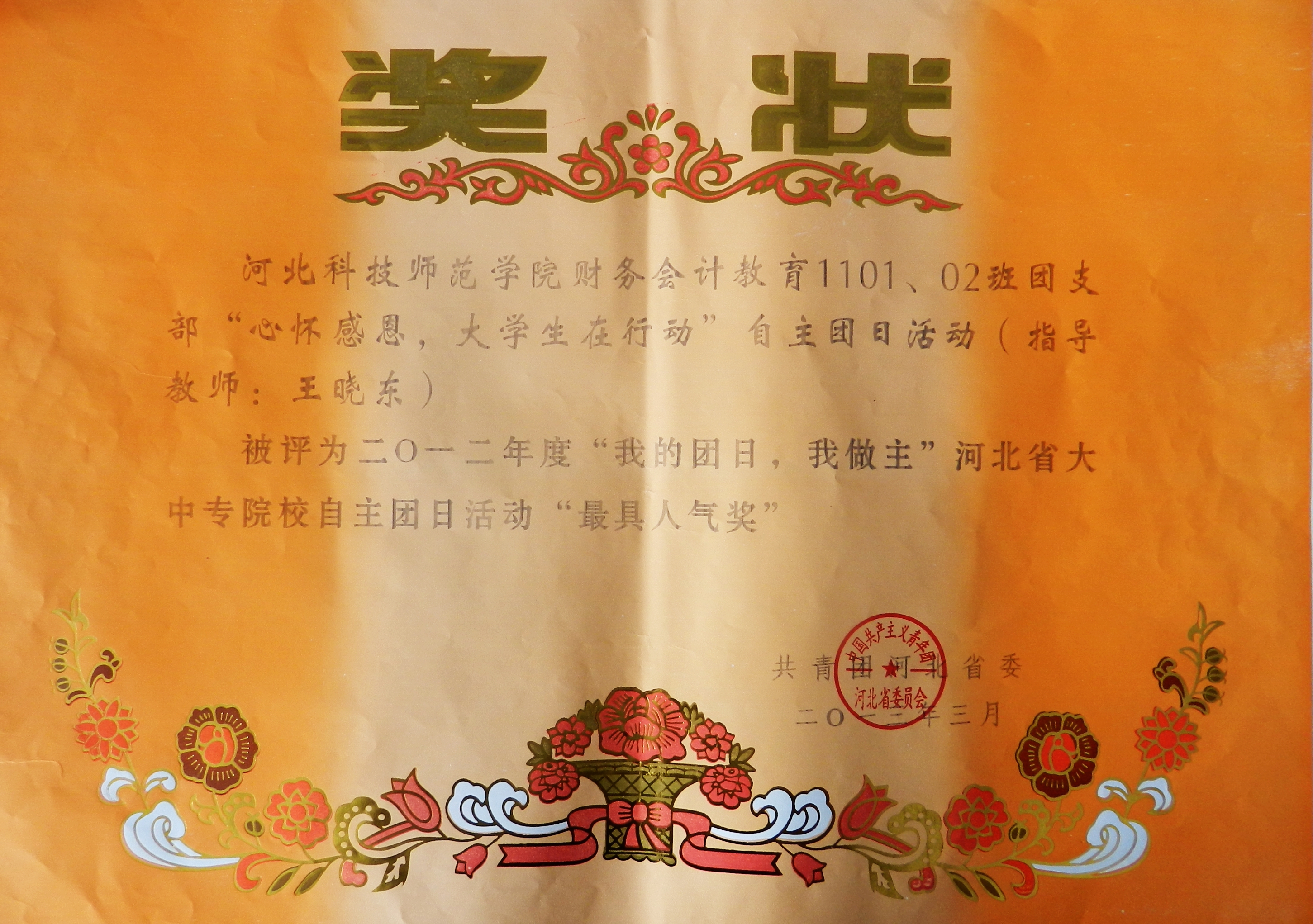 日前,团省委2012年河北省大中专院校“我的团日,我做主”自主团日活动评选结果揭晓,我院财务会计教育专业1101、02班团支部“心怀感恩,大学生在行动”自主团日活动荣获最具人气奖。此外,我校另有4个团支部的团...[详细]